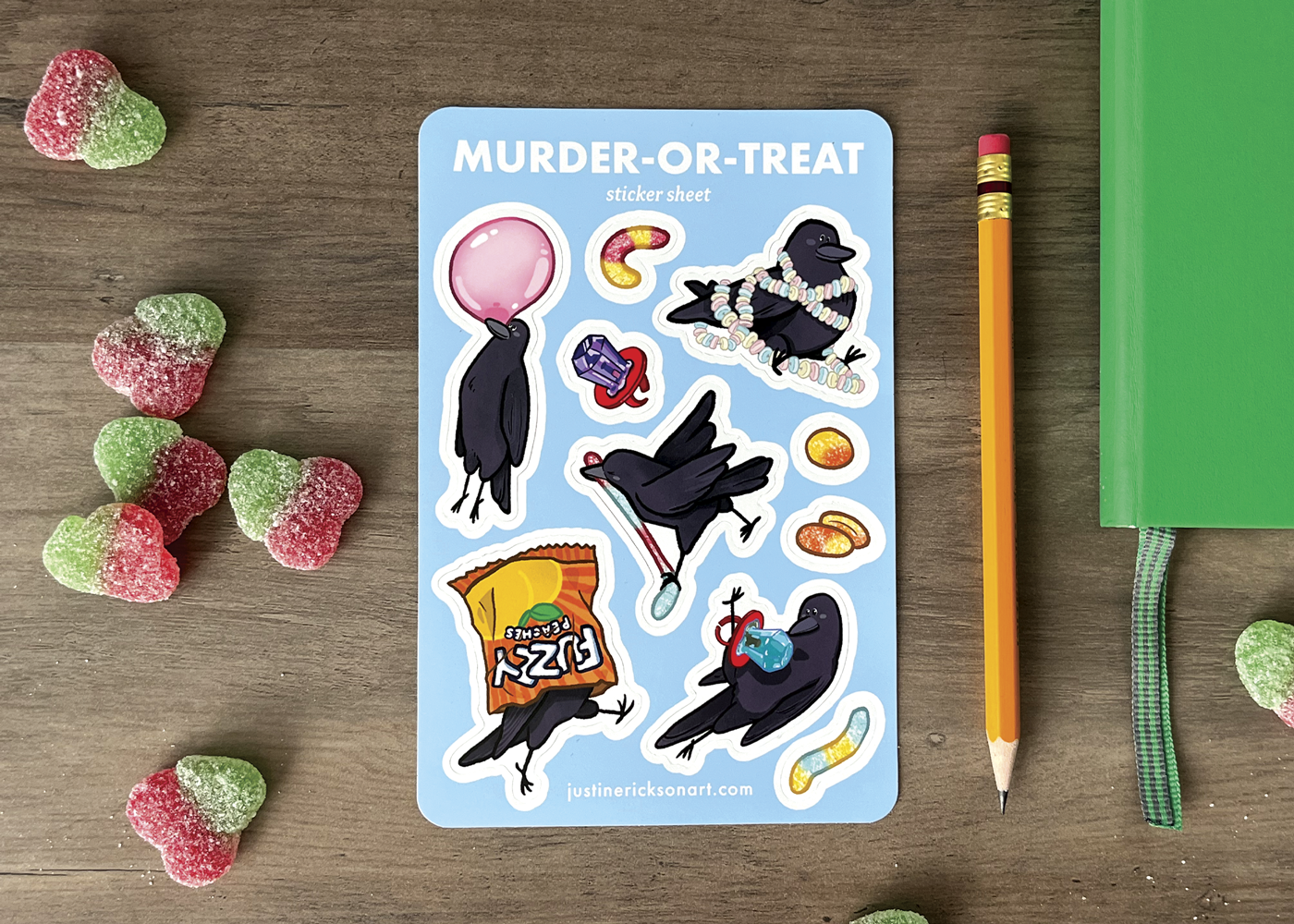 The Murder-or-Treat sticker sheet is perfect for your secret stash of treats! I mean notebook, phone, laptop, sketchbook, journal, and much more.